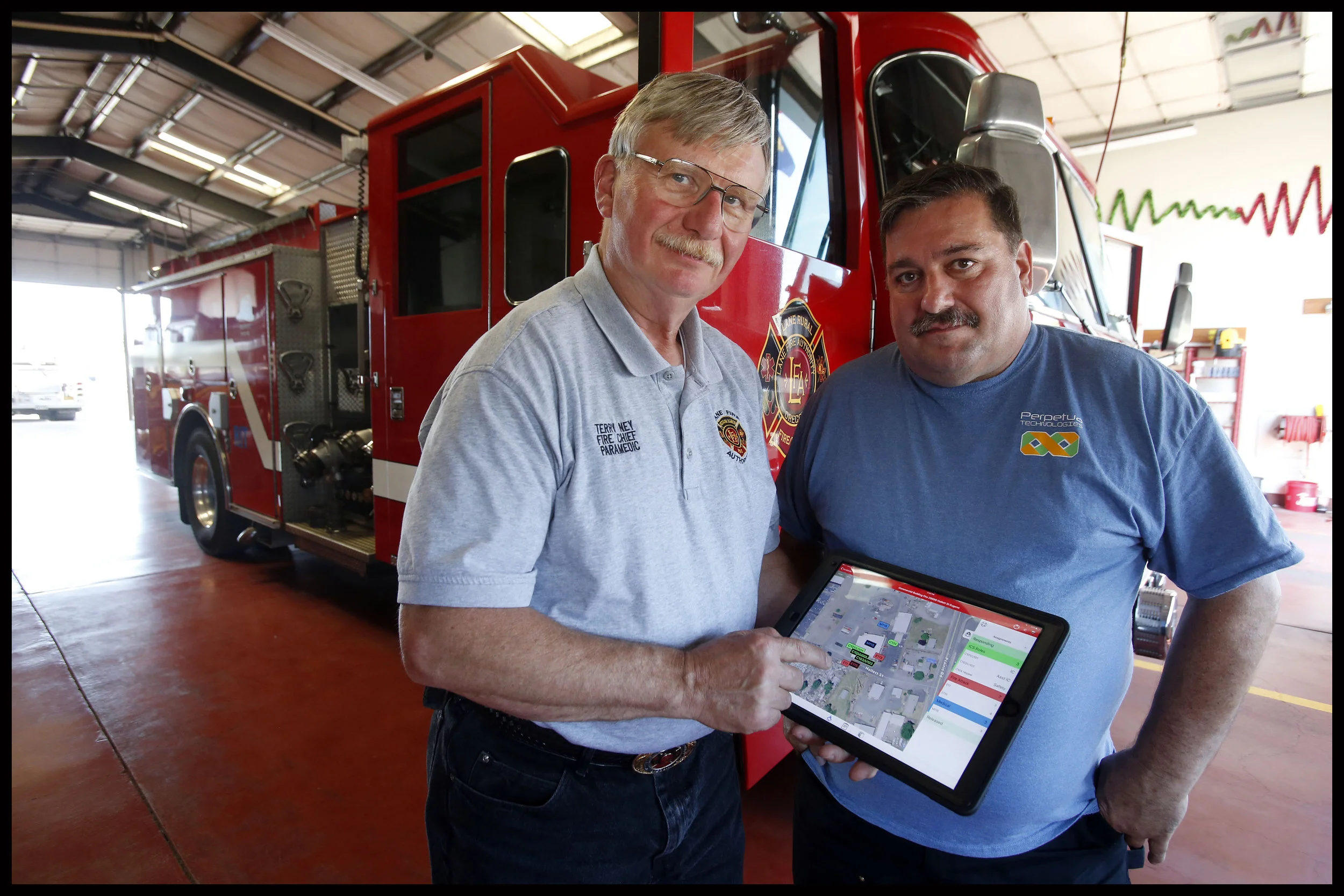 1/2 – Mike Speiser, right, a volunteer firefighter and software developer, worked with local fire chiefs, including Terry Ney at Lane County Fire, to develop software to improve emergency response to fires, wrecks, and other emergencies. This homegrown technology is being sold nationally from their offices in Eugene. (Andy Nelson/The Register-Guard)
